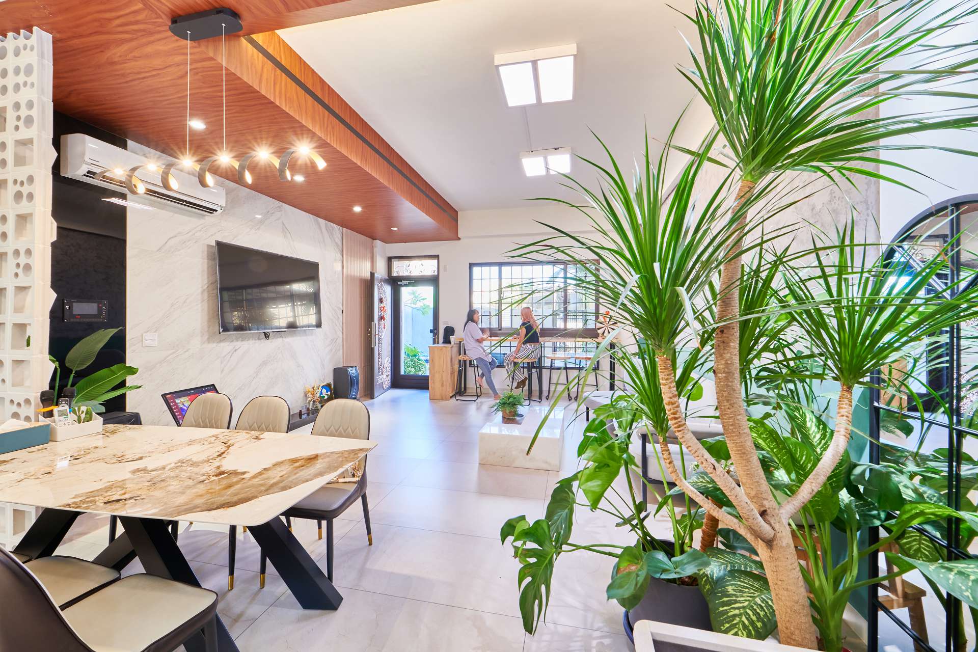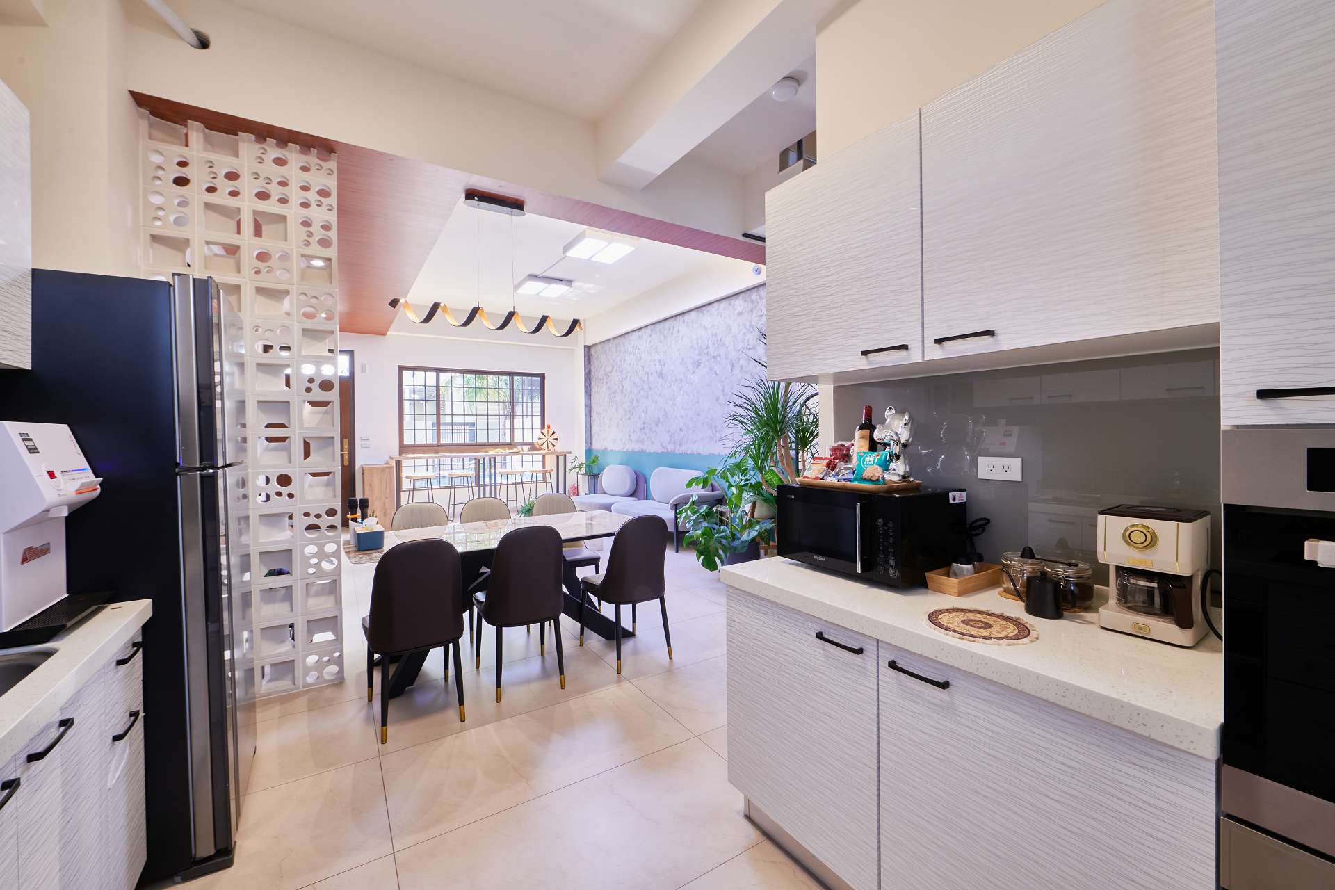 於是,外觀化繁為簡,與樹景彼此融合,綠意盎然的氛圍讓人在客廳就能貼近自然。